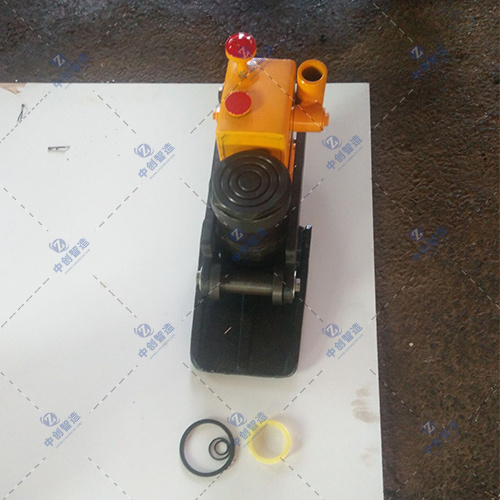本起道器采用伸縮套筒,雙泵,快速結構。當起道輪頂住鋼軌底部,擰緊回油閥,然后通過操作手柄搖臂,柱塞泵作往復運動,將壓力油注入油缸,在壓力油的作用下,(前半程在空載或低壓時具有快速上升功能)缸體逐步上升,通過起道杠桿及起道輪托住軌底進行起道。由于本機底座面積較大,因此在機具工作時,減少了機具的下降量,從而提高了工作效率。作業完畢后,打開回油閥,在鋼軌重量的作用下便使油缸下降復位至原生狀態。其結構由油箱,柱塞泵,油缸,回油閥,底座,起道杠桿,起道輪等組成,內部裝有快速裝置和安全閥。