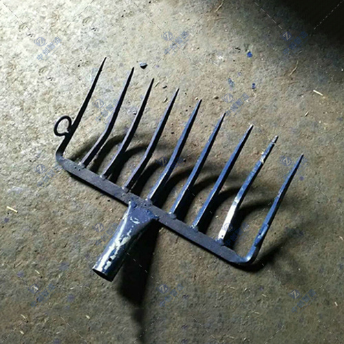 大拉耙由9齒弧形排列,耙兩側(cè)裝鐵絲,系繩索2-3根.柄長1.8-2.0m。作業(yè)人員為3-4人.即一人粑柄,2-3人拉繩;