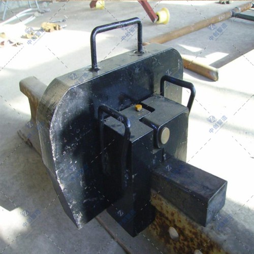 4、當鋼軌撞擊到位后,摘開墊板掛鉤,從鋼軌上取下墊板,并用大錘打擊撞軌器主體斜鐵槽大端平面上門口,從鋼軌上取下斜鐵及主體,撞軌結束。適用軌型:P50、60、75Kg/m鋼軌。